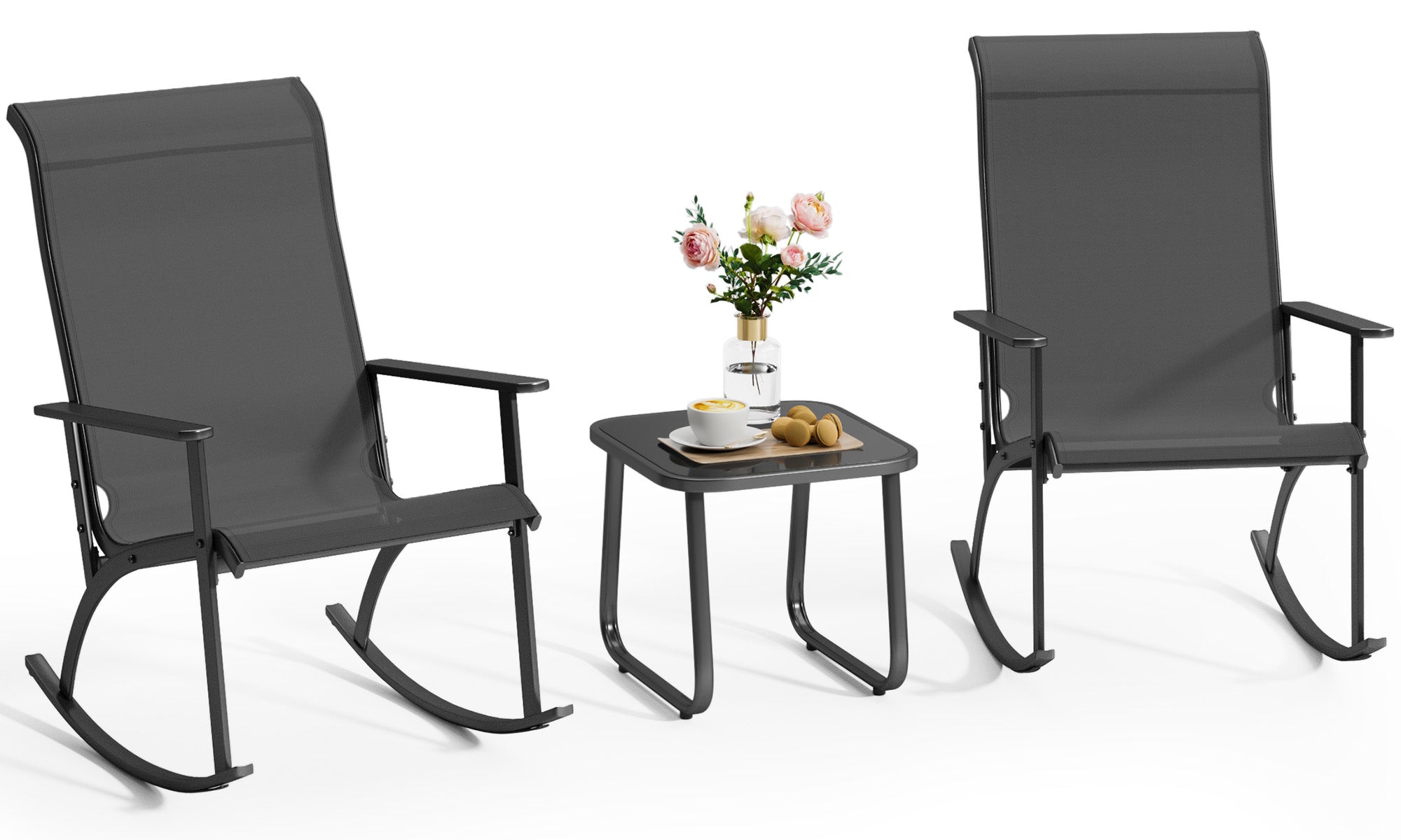 3 Piece Outdoor Rocking Bistro Set features UV-stabilized Textilene chairs and a waterproof tempered glass tabletop, ensuring year-round outdoor enjoyment in any climate.
