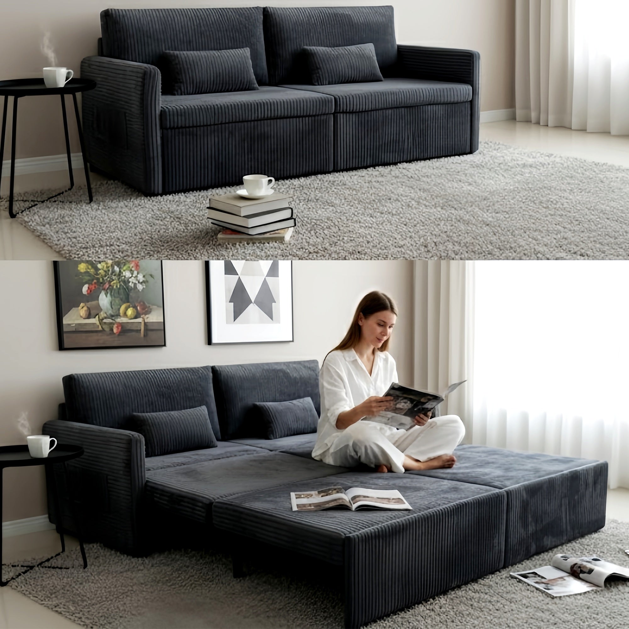 Equipped with a USB + Type-C fast-charging port, oversized side storage pockets, and stainless steel cup holders for easy cleaning. Quick 30–40 min assembly. King extends to 76"L (fits 2 adults) and Queen to 60"L—saving up to 40% space versus traditional sleeper sofas.